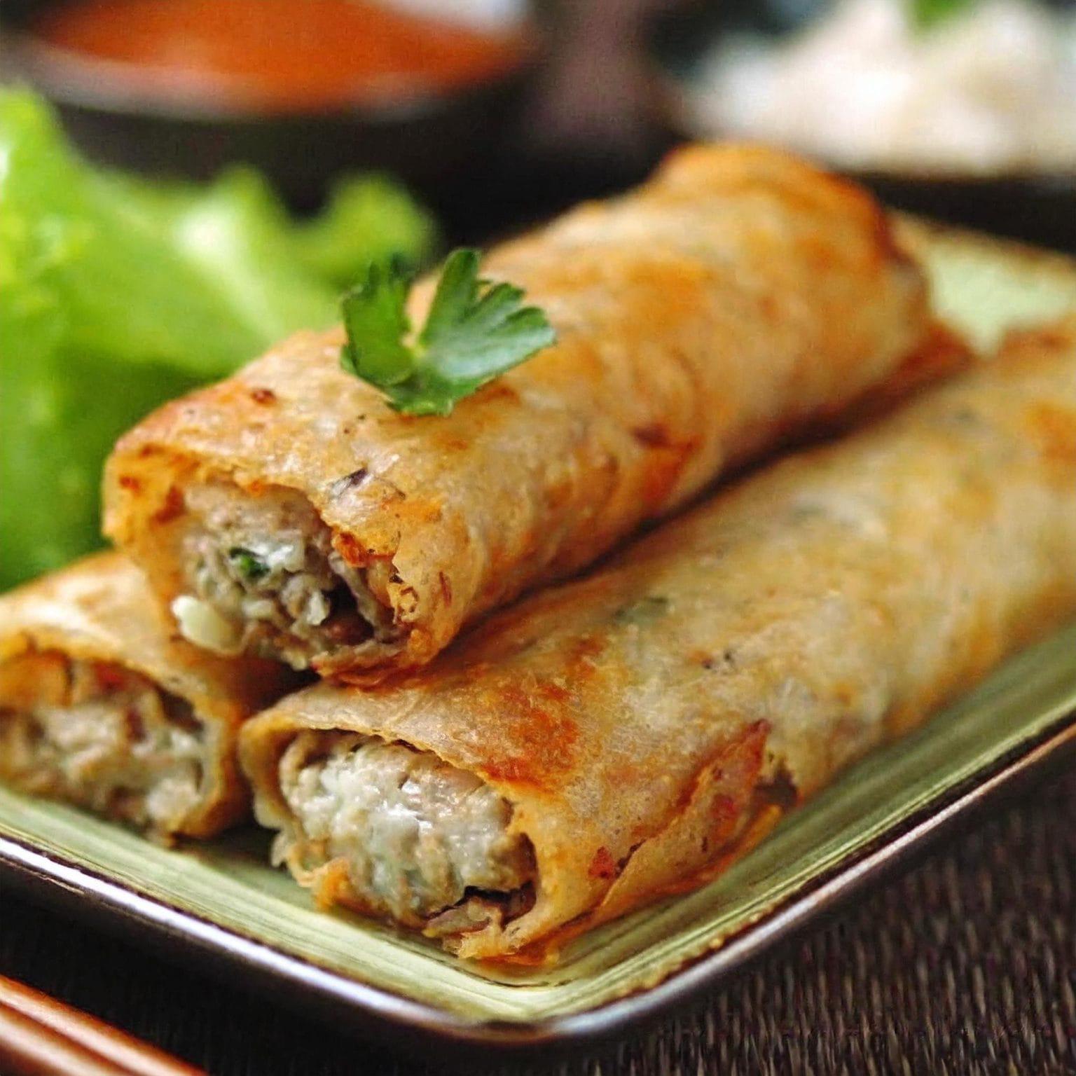 Crispy and golden Vietnamesespringrollsfilledwithflavorfulmincedpork or chicken, woodearmushrooms, glass noodles, and gratedcarrots, all wrapped in ricepaper and fried to perfection.